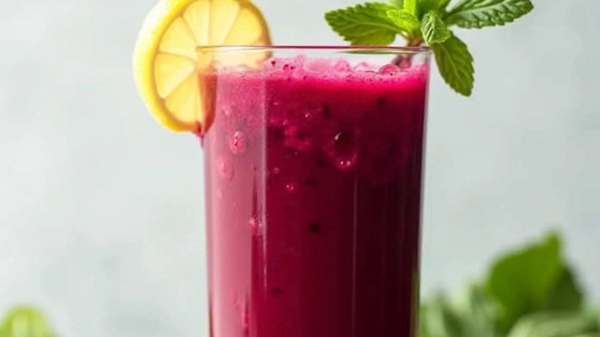 Este suco utiliza a beterraba, que é rica em ferro e ajuda na circulação sanguínea, combinada com a refrescância da hortelã.